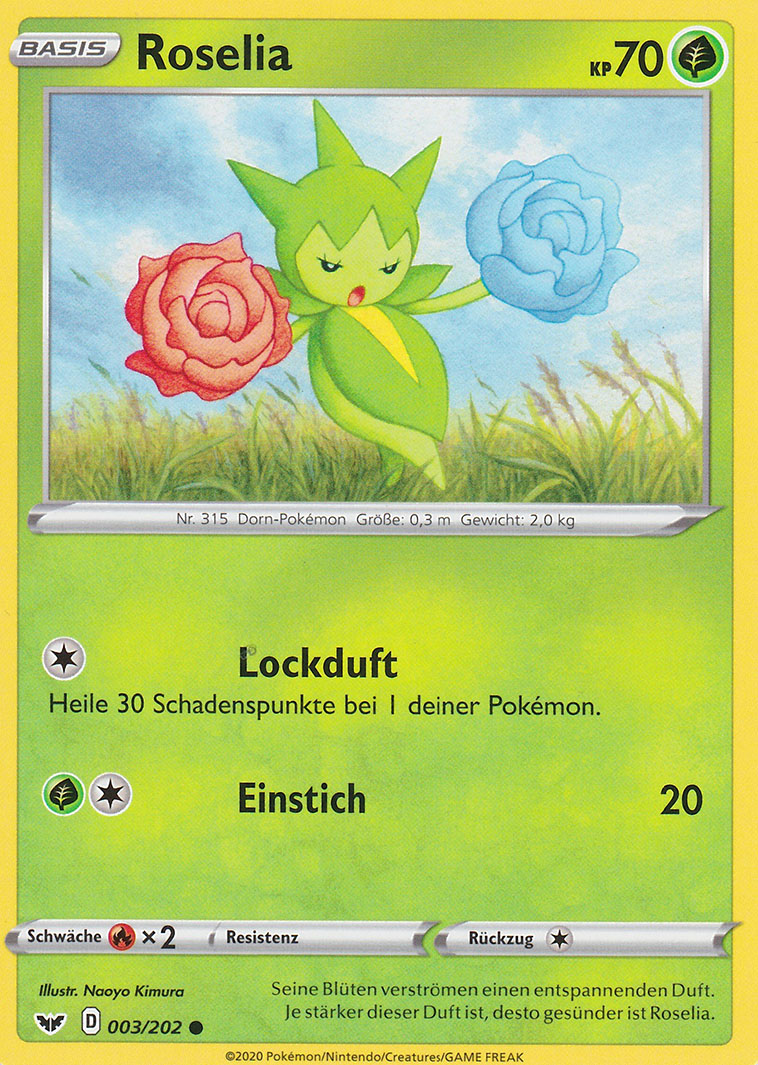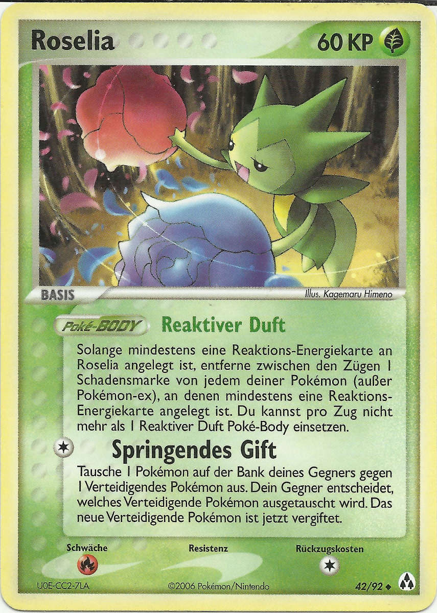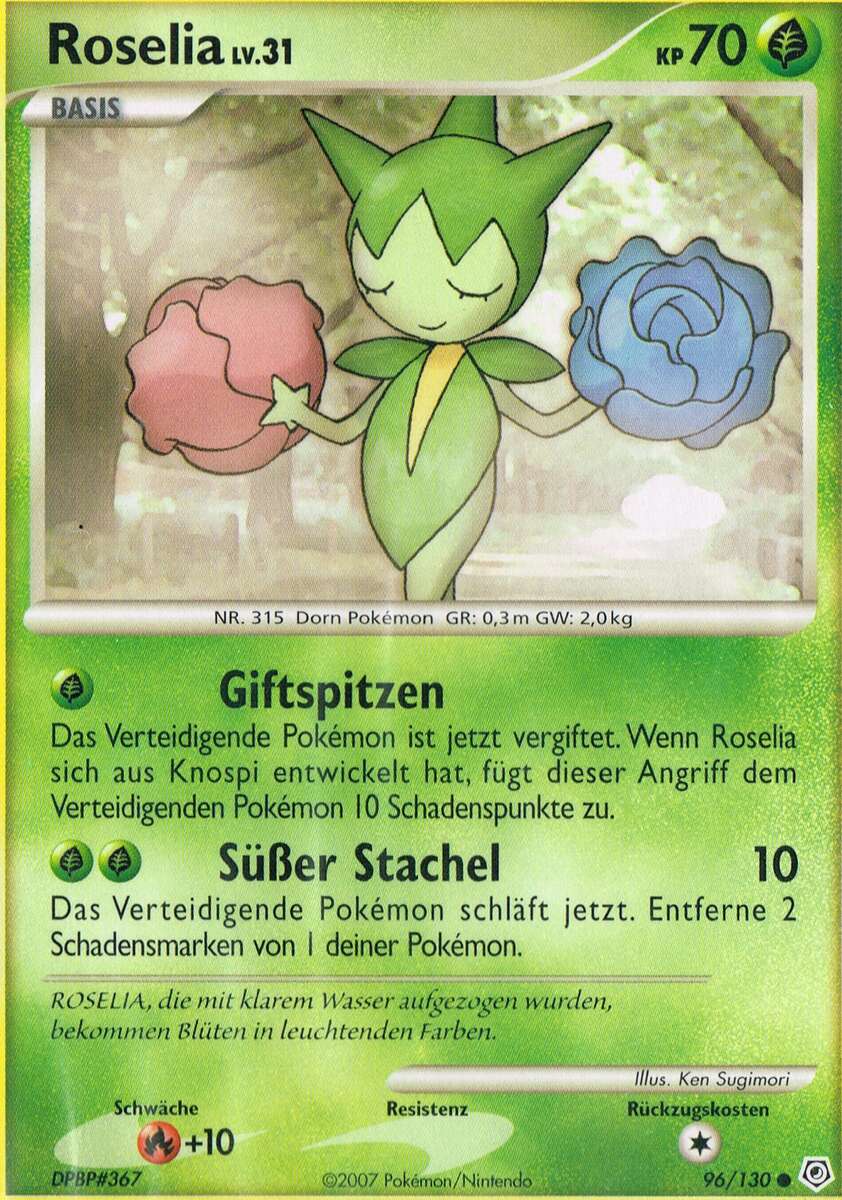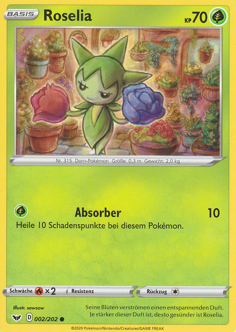 - OR Roselia verschießt scharfe Stacheln auf jeden Feind, der versucht, die Blumen an seinen Armen zu stehlen. Der Duft dieses Pokémon beruhigt Lebewesen.