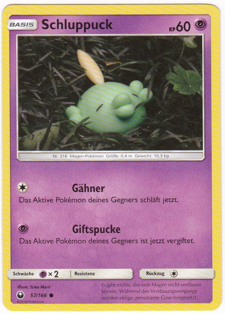 - S Die Magensäure dieses POKéMON ist so stark, dass sie selbst Gusseisen zersetzen kann. Es kann einen Gegenstand seiner Größe auf einmal verschlucken.