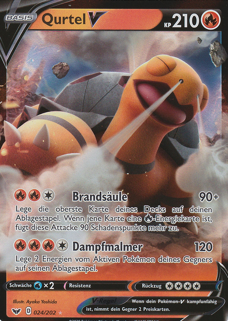 Durch die neue Fähigkeit und die neue Zuchtattacke (Eruption) kann diese Schildkröte richtig gefährlich werden. Da es eines der langsamsten Pokémon in VGC 17 ist, benötigt sie allerdings Unterstützung in Form von Bizarroraum oder Galanterie-Dressella. Die EVs wurden so verteilt, dass es möglichst viel austeilen und einstecken kann. Eruption ist Pflicht auf dem Set, da man damit am meisten Schaden verursachen kann. Falls die KP doch mal zu tief gesunken sind, hat auf dem zweiten Slot eine weitere Feuerattacke zur Verfügung. Da Rundumschutz nun häufiger gespielt wird, ist hier Flammenwurf oder Hitzekoller zu empfehlen. Der dritte Slot dient der "Coverage" und man kann sich zwischen Solarstrahl gegen Wasserpokémon oder Kraftreserve Eis gegen Drachenpokémon entscheiden, wobei man mit der Kraftreserve einen ungeraden Angriffs-DV haben muss, um die wichtige minimale Initiative erreichen zu können. Schutzschild auf dem letzten Slot ist im Doppel Pflicht.