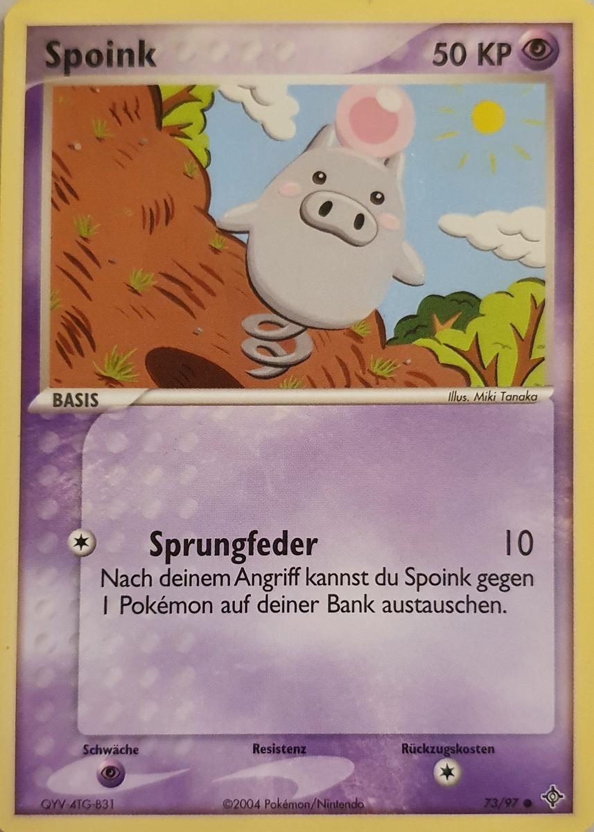 - OR Spoink hüpft auf seinem Schweif durch die Gegend. Die Erschütterung des Hüpfens bringt sein Herz zum Schlagen. Deshalb kann dieses Pokémon das Hüpfen nicht sein lassen, ansonsten würde sein Herz aufhören zu schlagen.