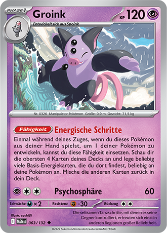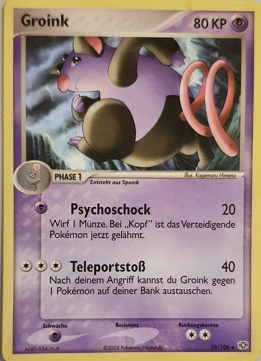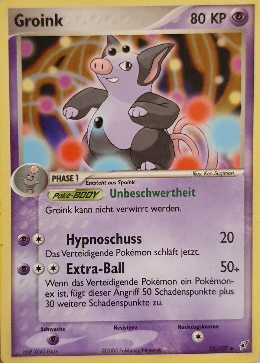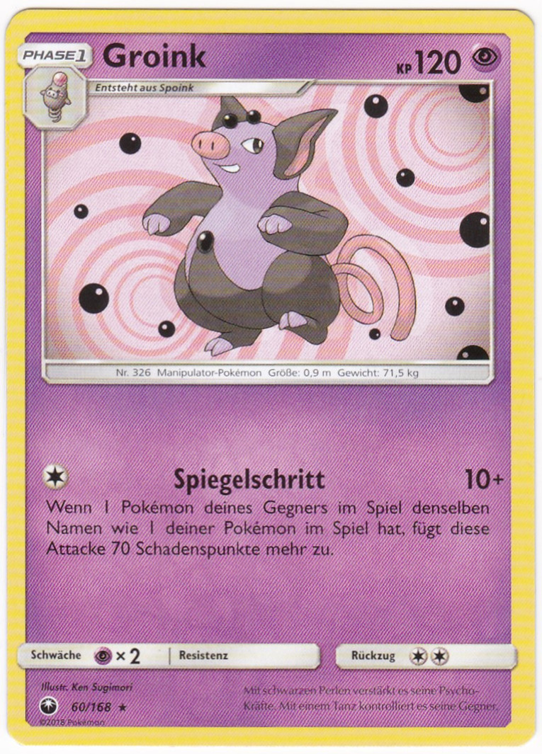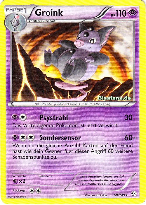 - S GROINK benutzt die schwarzen Perlen an seinem Körper, um seine fantastischen Kräfte nutzen zu können. Dabei tanzt es sonderbar. Die schwarzen Perlen dieses POKéMON sind wahre Kunstwerke und ebenso wertvoll.