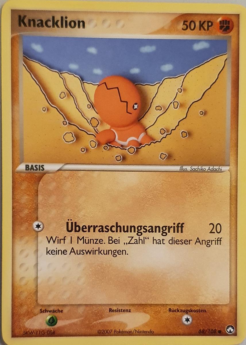 - R KNACKLIONs Bau ist eine Art in den Sand gegrabener Kessel. Dieses POKéMON wartet geduldig auf Beute, um sie in seinen Bau zu werfen. Seine gigantischen Kiefer verfügen über genügend Kraft, um einen Felsen zu zerquetschen.