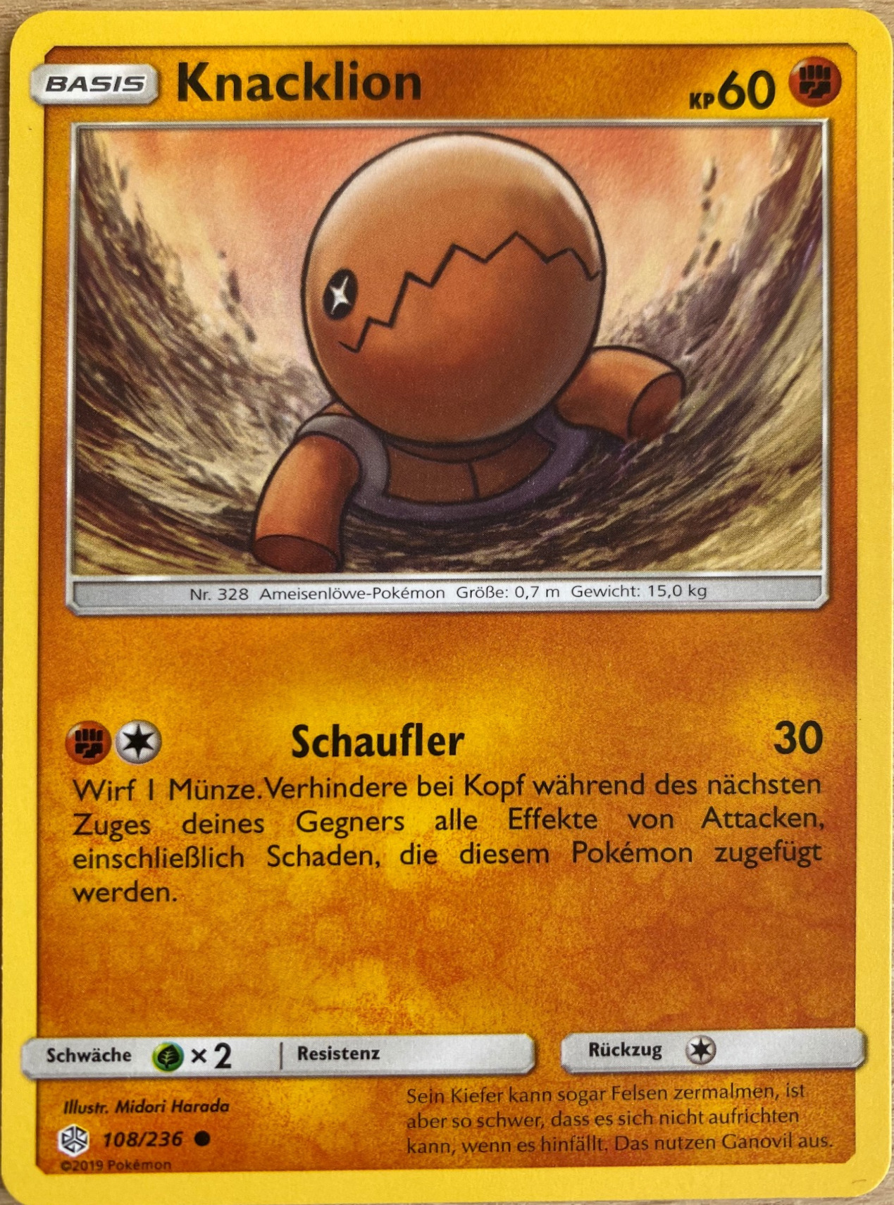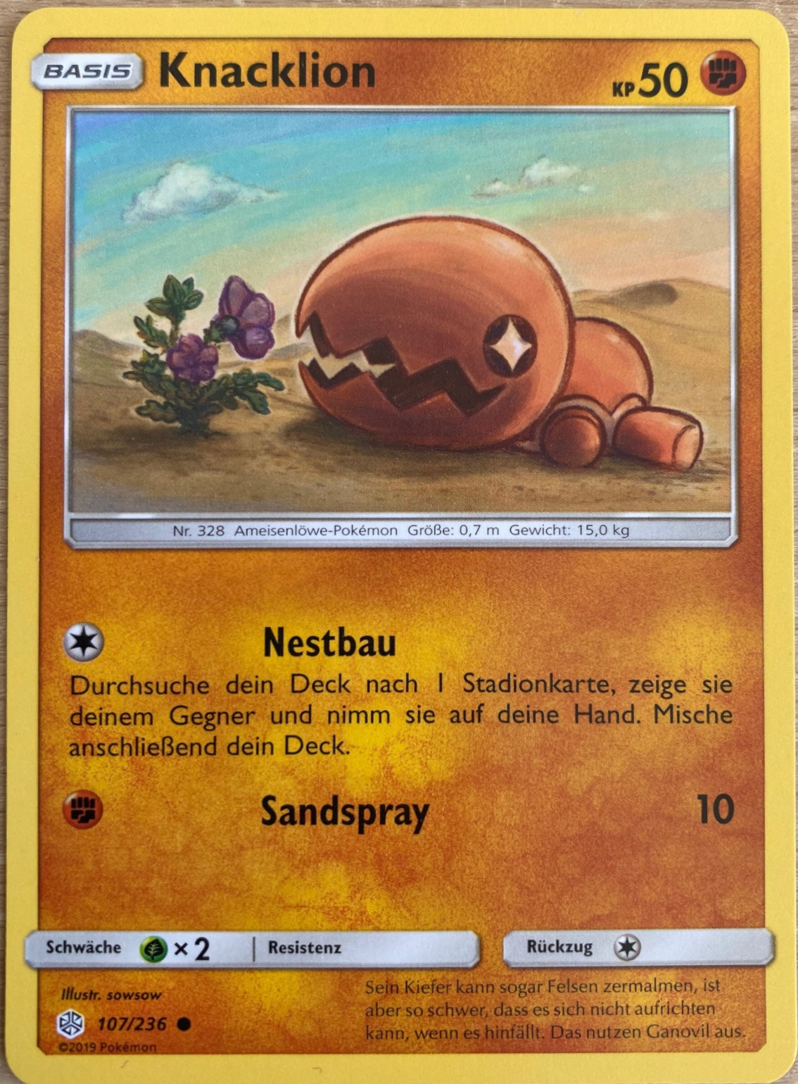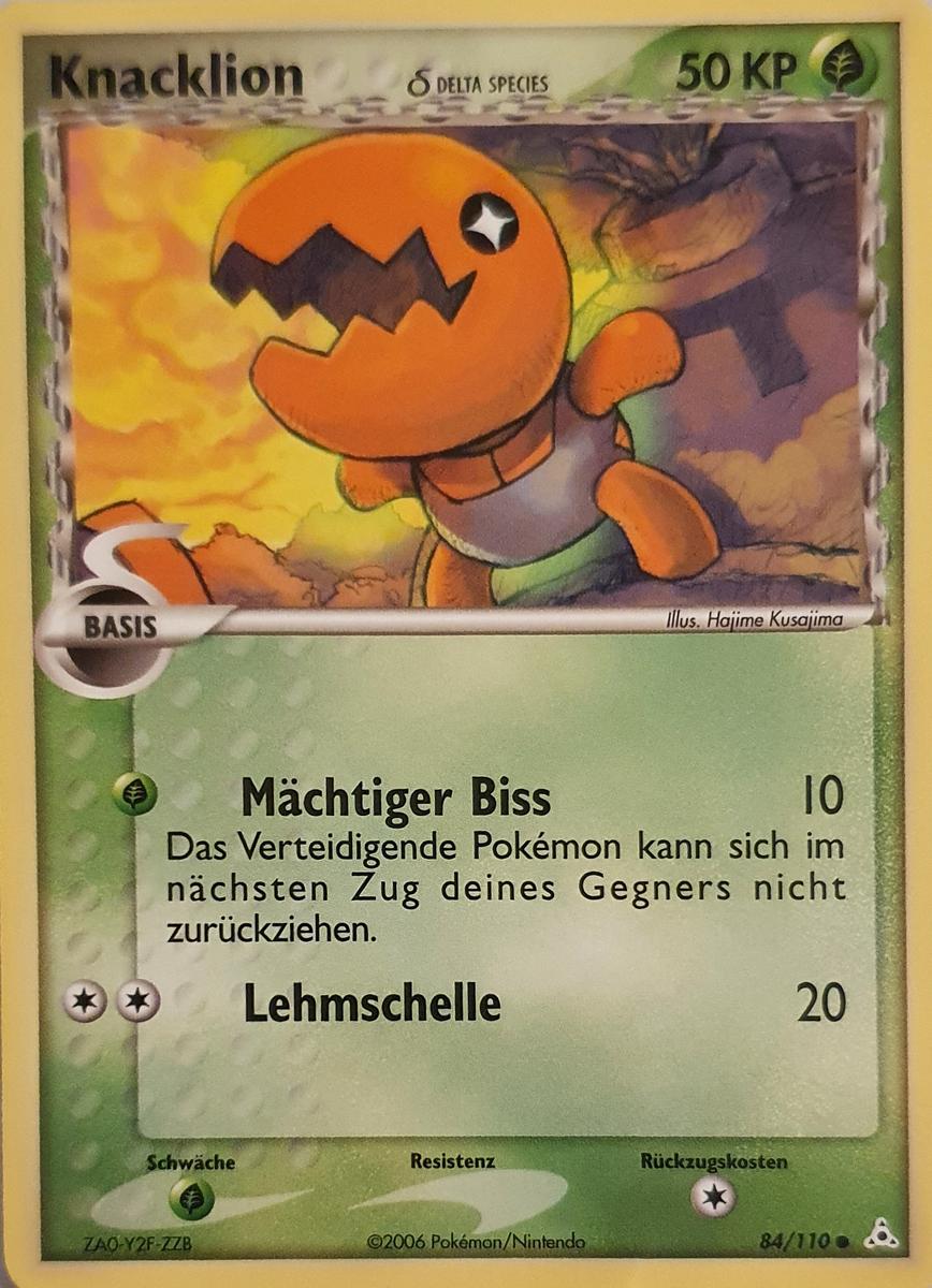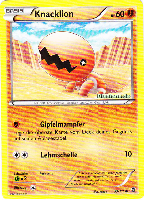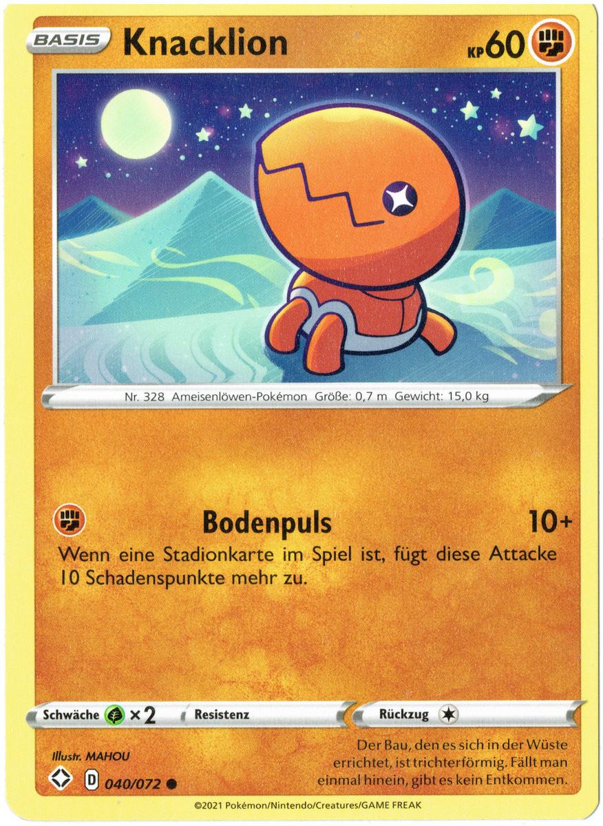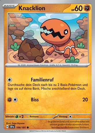 - OR Knacklions Bau ist eine Art in den Sand gegrabener Kessel. Dieses Pokémon wartet geduldig darauf, dass Beute in seinen Bau hineinfällt. Seine gigantischen Kiefer verfügen über genügend Kraft, um einen Felsen zu zerquetschen.