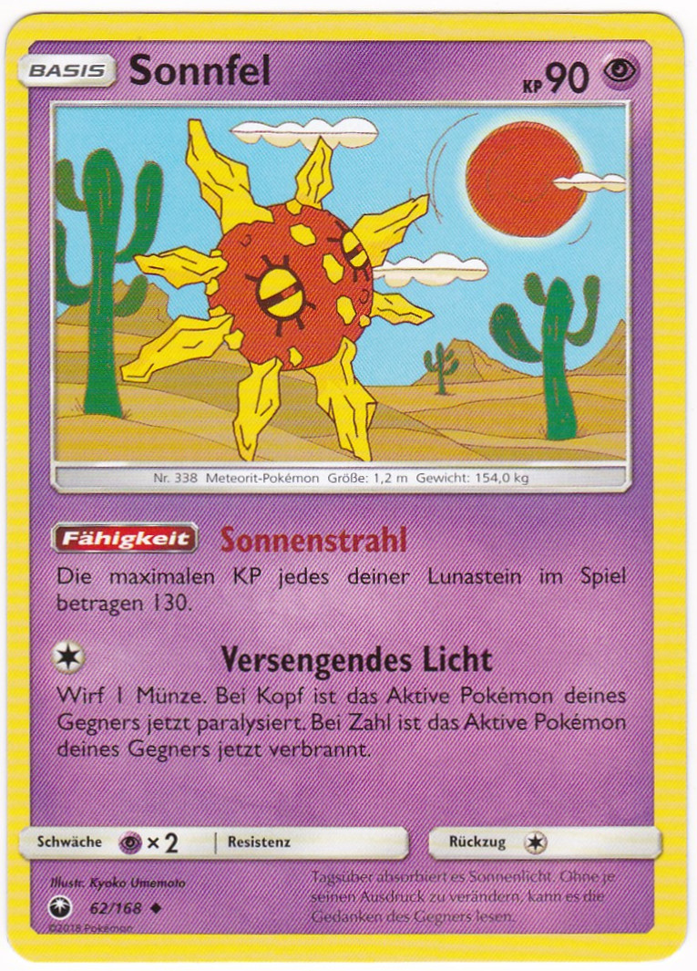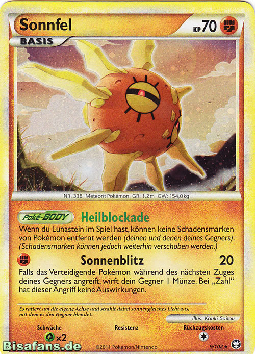 - OR Sonnfel ist eine neue Pokémon-Art, die angeblich aus dem Weltall kam. Es gleitet durch die Luft und bewegt sich leise. Im Kampf setzt dieses Pokémon sehr helles Licht ein.