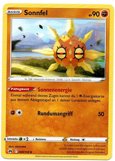 Sonnfel besitzt die Pokédex-Nummer #338 und ist ein Gestein / Psycho-Pokémon der dritten Generation. Seinen ersten Auftritt in Videospielen hat es in Pokémon Rubin & Saphir.