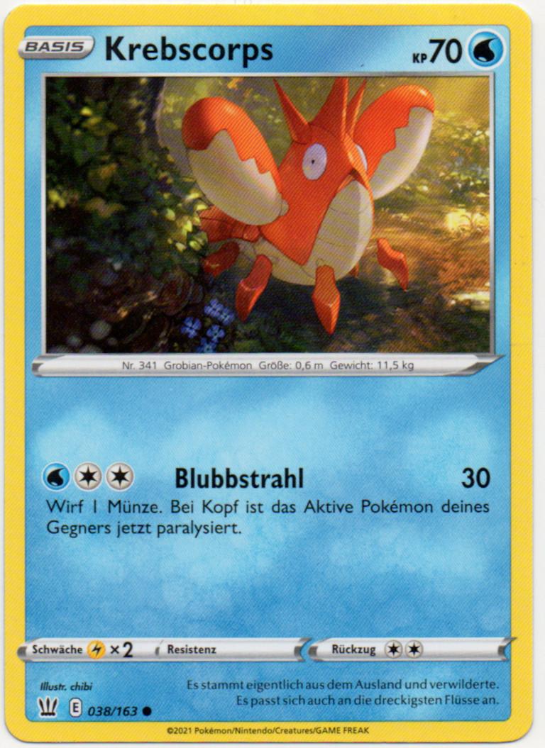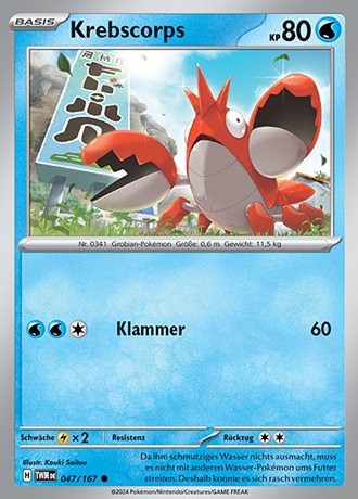 Krebscorps besitzt die Pokédex-Nummer #341 und ist ein Wasser-Pokémon der dritten Generation. Seinen ersten Auftritt in Videospielen hat es in Pokémon Rubin & Saphir.