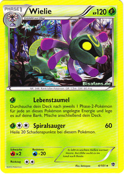 - OR Wielie sucht den Meeresboden nach Beute ab. Dieses Pokémon fährt seinen baumstammartigen Nacken aus und fängt mit seinen acht Tentakeln Beute.