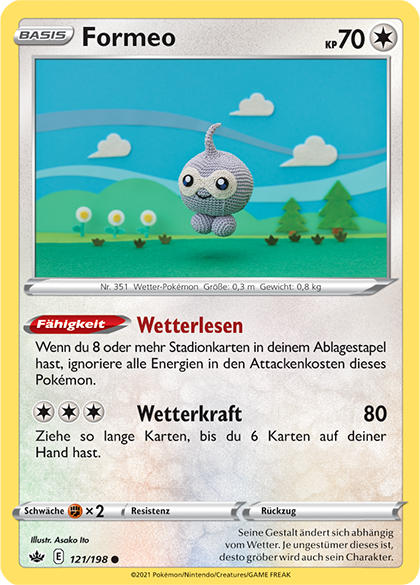 - R FORMEOs Erscheinung ändert sich mit dem Wetter. Dieses POKéMON hat die Fähigkeit erworben, die mächtige Kraft der Natur zu nutzen, um seinen winzigen Körper zu schützen.