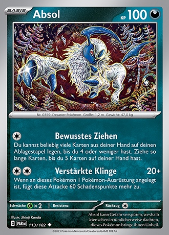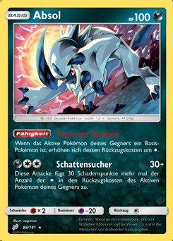 - S Aus Aberglauben war Absol einst als Unheilsbote verhasst und wurde in die tiefsten Berge vertrieben.