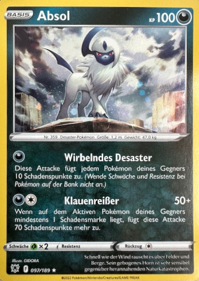 - AS Absol kann bevorstehende Naturkatastrophen voraussagen. Es lebt auf einem kargen, zerklüfteten Berg. Dieses Pokémon wagt sich nur sehr selten ins Tal herunter.