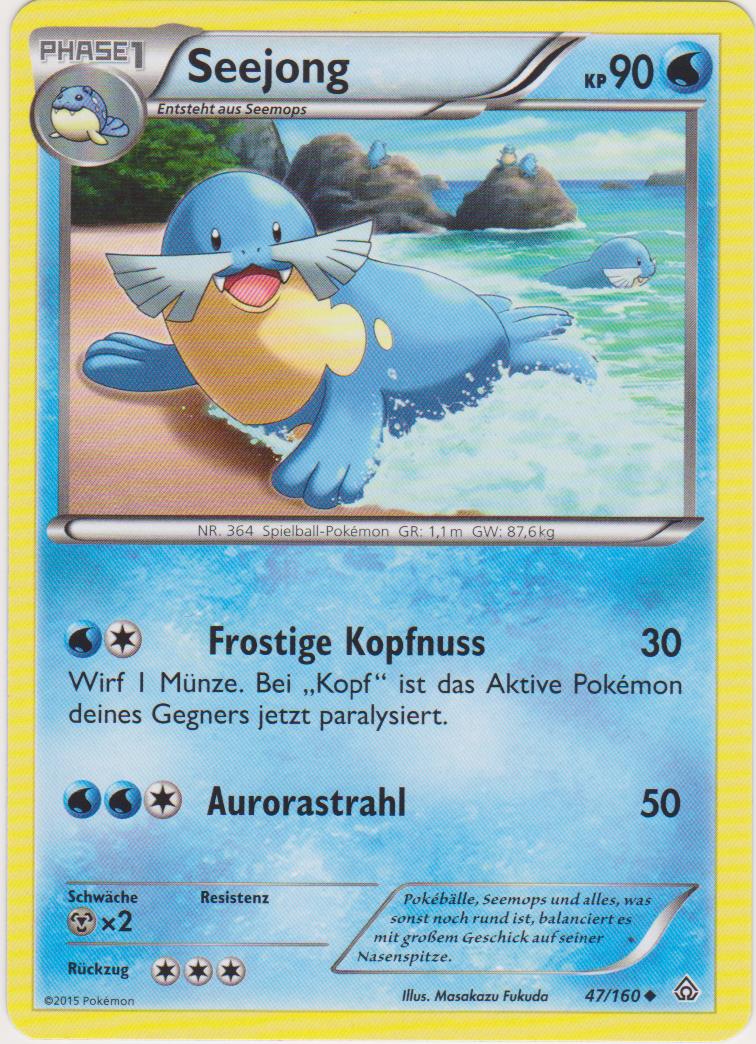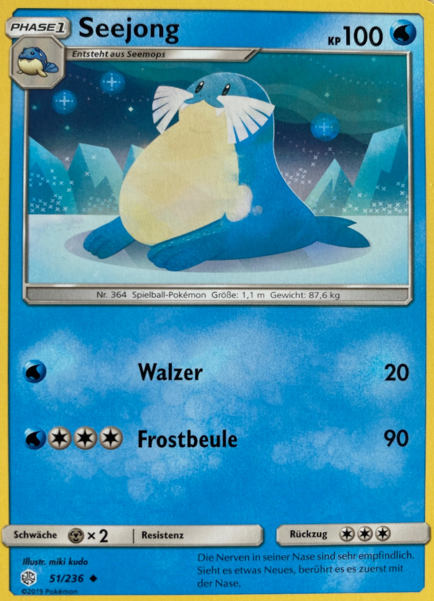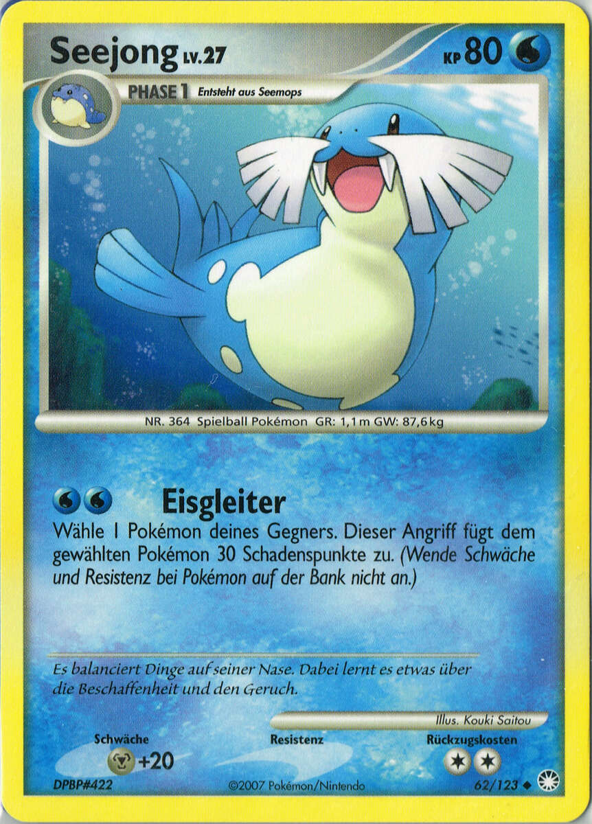 - OR Seejong hat die Angewohnheit, alles, was es zum ersten Mal sieht, auf seiner Nasenspitze zu jonglieren. Dieses Pokémon hält sich bei Laune, indem es manchmal ein Seemops auf seiner Nase balanciert und hin- und herrollt.