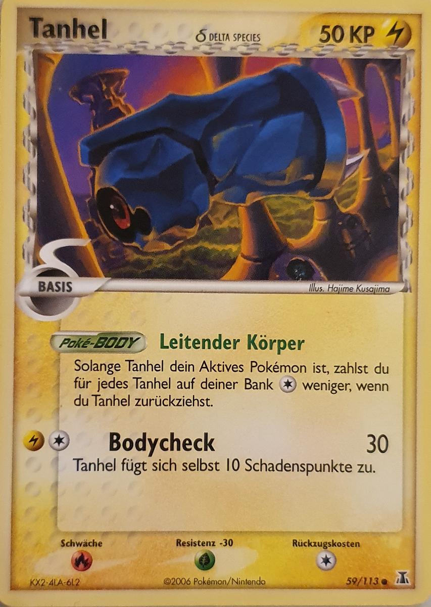 - R Anstelle von Blut fließt eine starke magnetische Energie durch TANHELs Körper. Dieses POKéMON kommuniziert mit anderen, indem es kontrollierte magnetische Impulse aussendet.