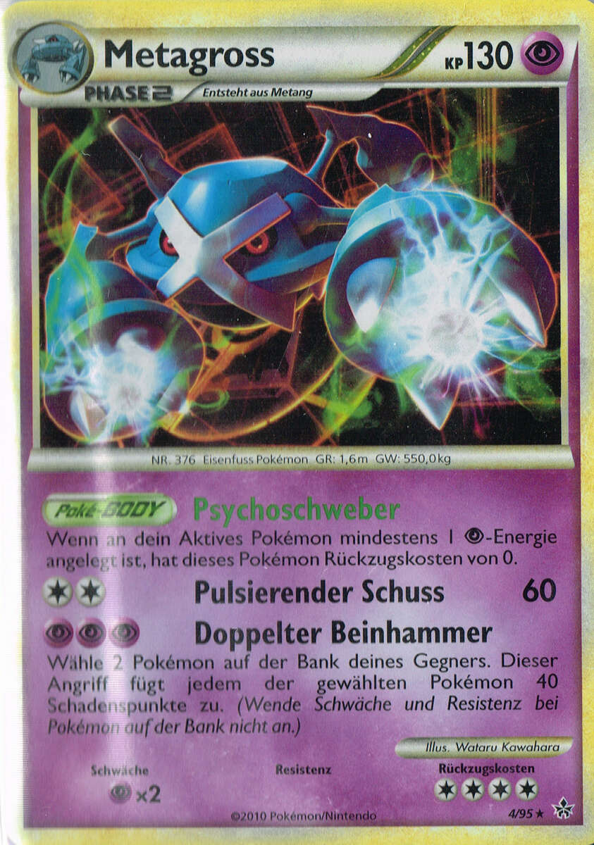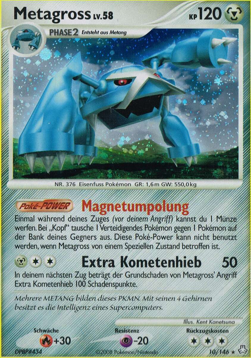 - R METAGROSS hat insgesamt vier Gehirne. Diese können schwierige Berechnungen schneller lösen als ein Supercomputer. Dieses POKéMON kann durch die Lüfte schweben, indem es seine vier Beine einklappt.