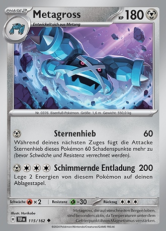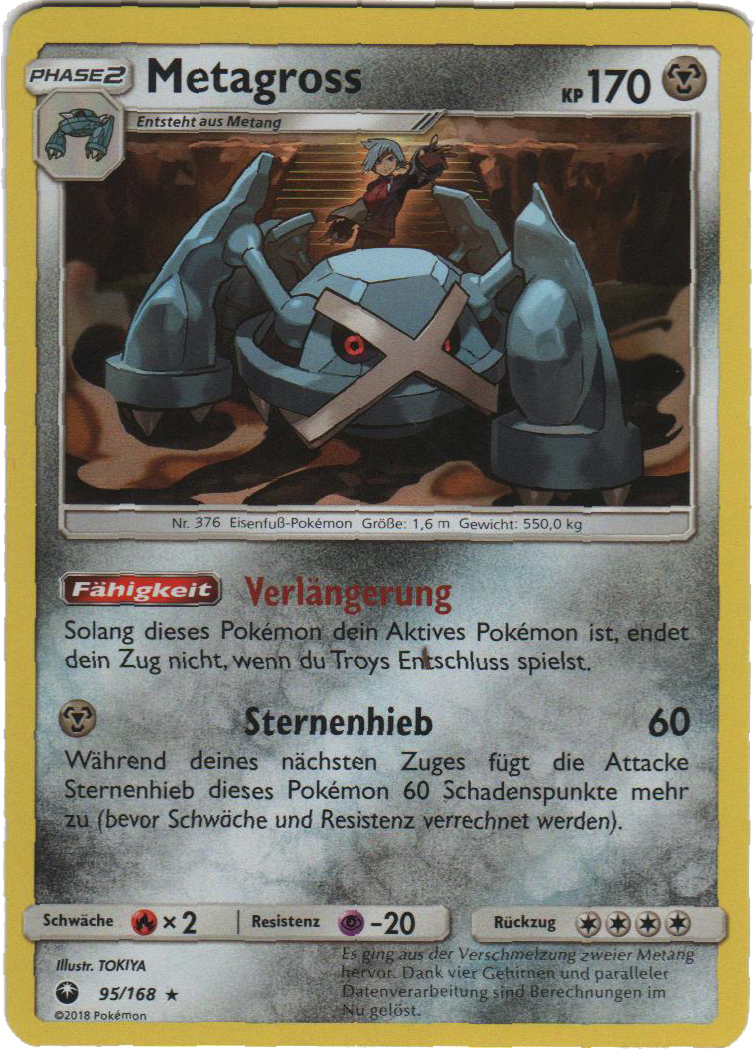 - S METAGROSS ist aus der Verschmelzung zweier METANG hervorgegangen. Auf der Jagd drückt es seine Beute mit seinem massigen Körper zu Boden. Dann frisst es sein hilfloses Opfer auf.