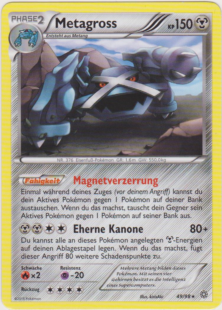 - AS Metagross ist aus der Verschmelzung zweier Metang hervorgegangen. Auf der Jagd drückt es seine Beute mit seinem massigen Körper zu Boden. Dann frisst es sein hilfloses Opfer mit seinem großen Maul auf.