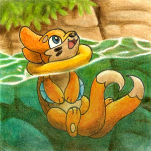 Mit geübter Leichtigkeit schwamm Bamelin dem untergehenden grünen Stein hinterher. Seine beiden Schweife nutzte es als Propeller, um schneller voranzukommen und seine Kraft vorerst zu schonen. Schließlich nahm es das funkelnde Objekt in seine Pfoten und bahnte sich einen Weg an die Oberfläche. Mit hohem Tempo sprang es aus dem Wasser und machte dabei einen Salto, bevor es wieder im kühlen Nass landete. In der Zwischenzeit hatte es jedoch Luft geholt und so seinen Schwimmreifen um den Hals aufgebläht, sodass es den Kopf oben halten konnte. Zufrieden hielt es den Stein in die Höhe.