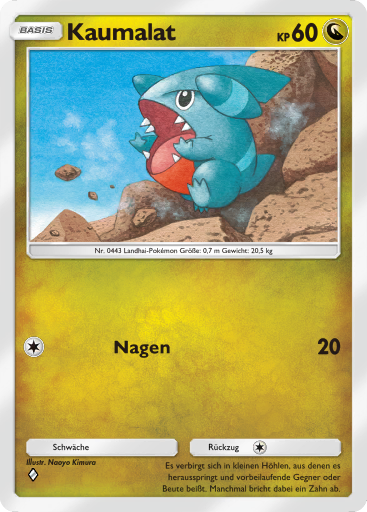 - SD Dieses Pokémon nistet in kleinen Löchern in Höhlenwänden. Es springt Beute an, die sich zu nah heranwagt, und schnappt zu.