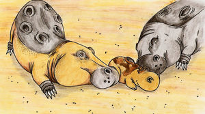 - P Das weit aufgerissene Maul demonstriert seine Stärke. Es attackiert, indem es Sandmassen aufwirbelt.