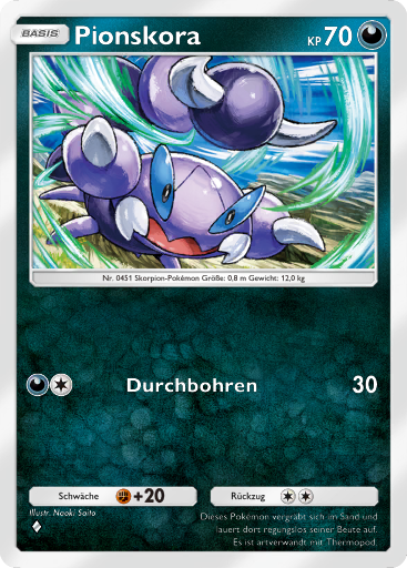 - NPS Auf der Suche nach Futter versteckt es sich im Sand und wartet auf Beute. Pionskora ist ein sehr geduldiges Pokémon, das lange ohne Nahrung auskommen kann.