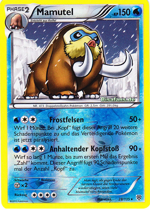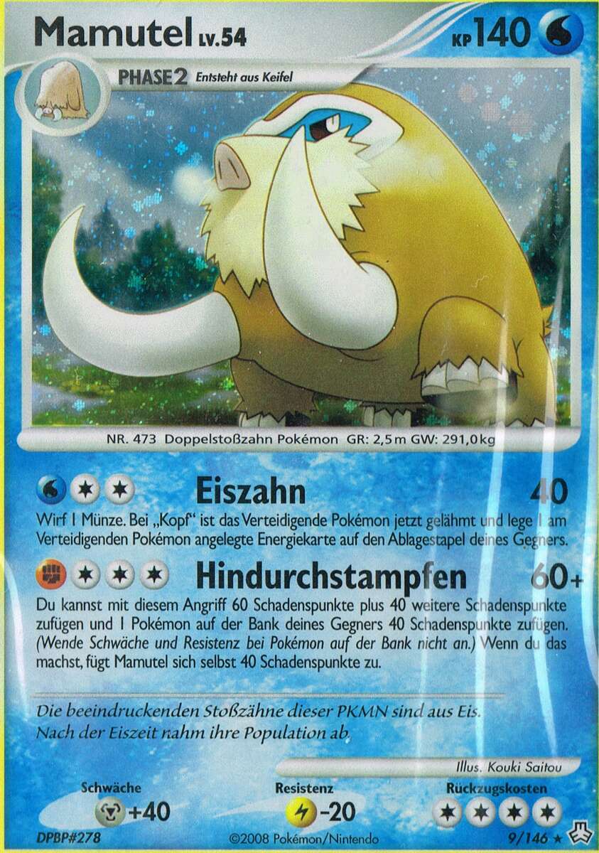 - DP Die beeindruckenden Stoßzähne dieser PKMN sind aus Eis. Nach der Eiszeit nahm ihre Population ab.