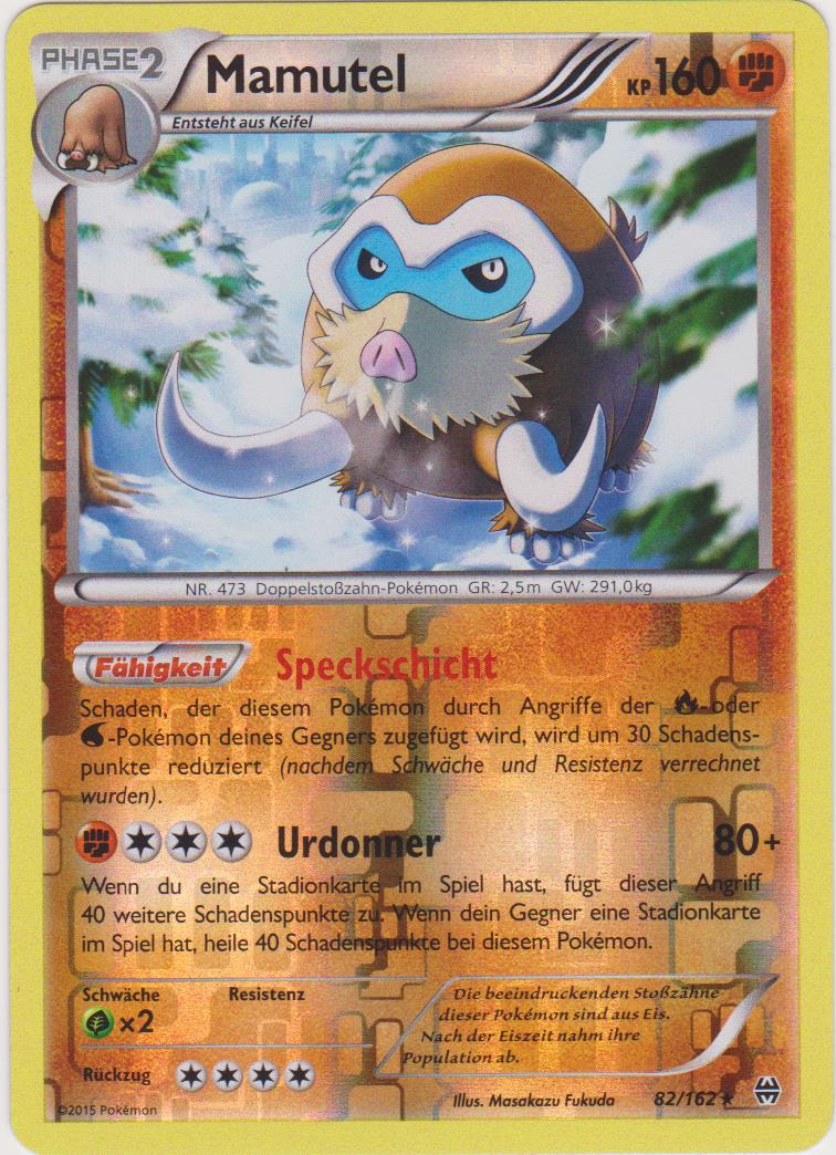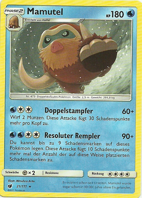 - AS Die beeindruckenden Stoßzähne dieser Pokémon sind aus Eis. Nach der Eiszeit nahm ihre Population ab.