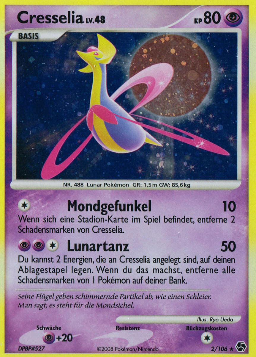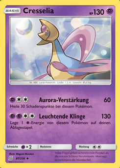 Cresselia gilt als eine der universellen Walls im 3vs3. Eisstrahl ist Pflicht, um Brutalanda und Knakrack sicher zu besiegen, sowie Mondschein um sich sicher hoch zu heilen. Die letzten zwei Attacken kann man je nach Team wählen. Für Teams mit vielen offensiven Pokemon ist Lunartanz und Donnerwelle/Toxin empfehlenswert. Bizarroraum ist für TR/Bulky Teams gut und Psychokinese falls man neben Eisstrahl noch einen Psycho-STAB will. Der Beulenhelm bestraft Kontaktangriffe, aber auch bspw. eine Giefebeere ist denkbar, durch die sich Cresselia einmalig um 50% heilen kann, wenn es stark angeschlagen ist.