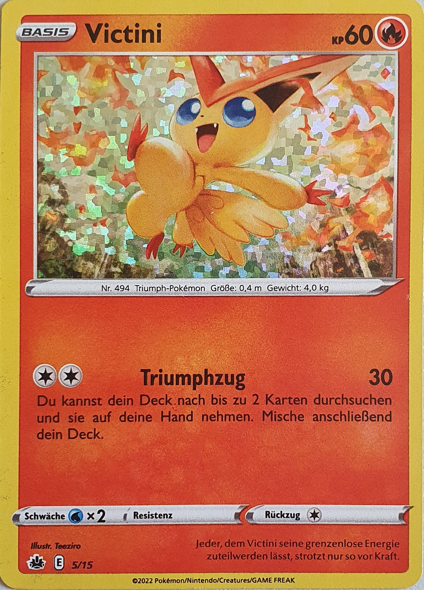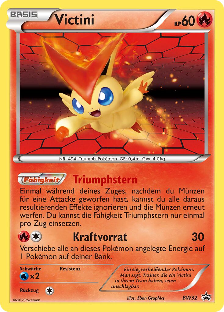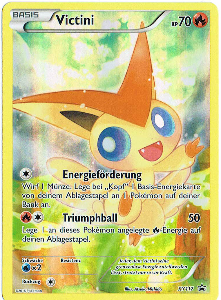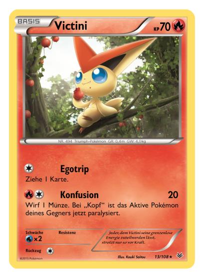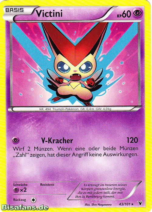 - X Ein siegverheißendes Pokémon. Man sagt, Trainer, die ein Victini in ihrem Team haben, seien unschlagbar.