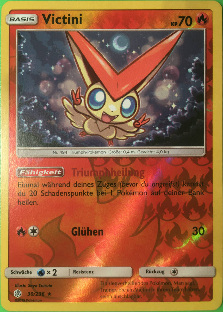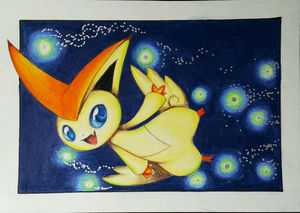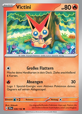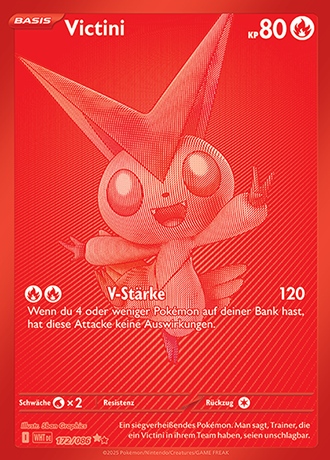 - OR Ein siegverheißendes Pokémon. Man sagt, Trainer, die ein Victini in ihrem Team haben, seien unschlagbar.