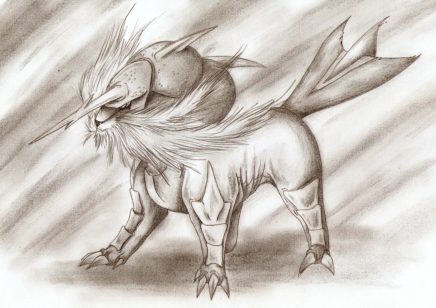 - W Schüchtert Gegner allein durch seinen Ruf ein. Ein Teil der Panzerung an seinen Vorderbeinen dient ihm als Langschwert.