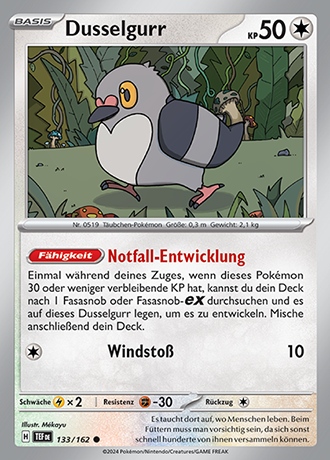 Dusselgurr besitzt die Pokédex-Nummer #519 und ist ein Normal / Flug-Pokémon der fünften Generation. Seinen ersten Auftritt in Videospielen hat es in Pokémon Schwarz & Weiß.
