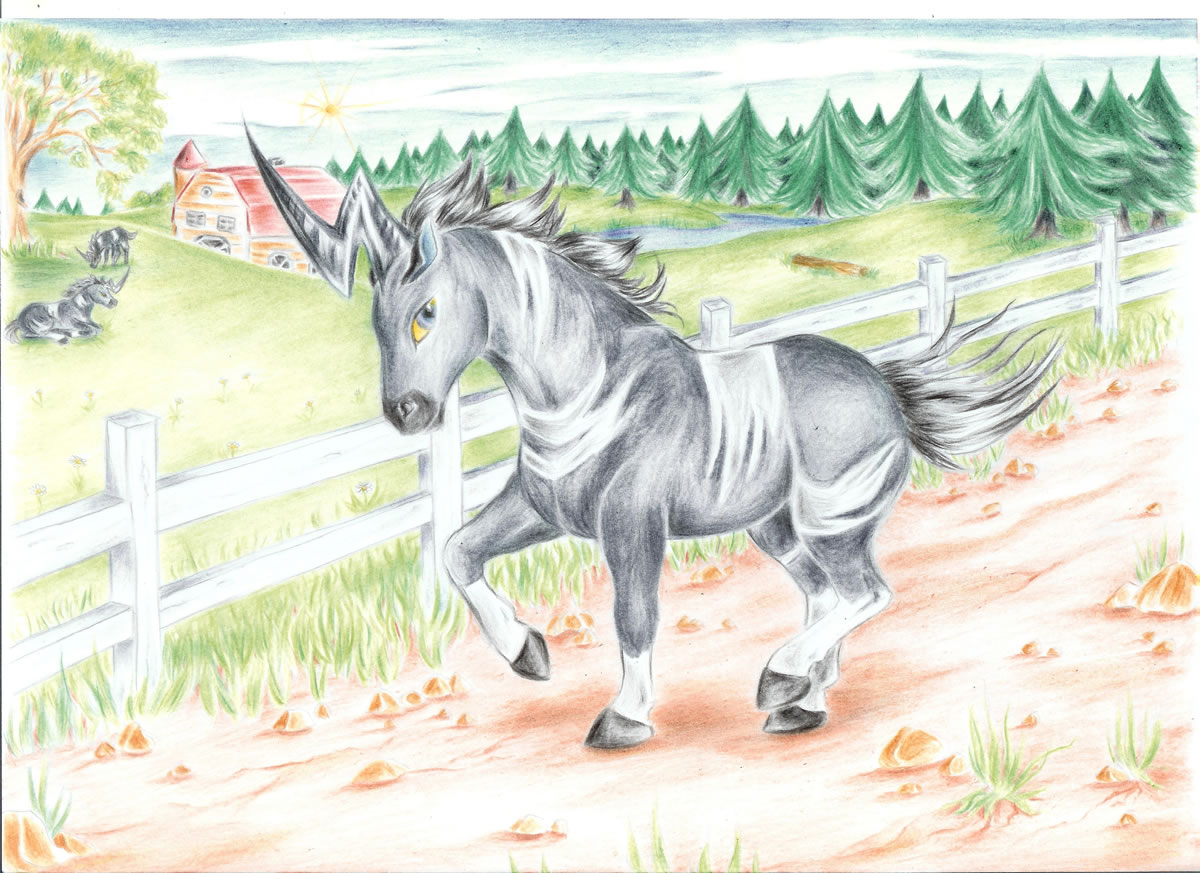 - OR Es erscheint, wenn Gewitterwolken den Himmel verdunkeln. Es fängt mit seiner Mähne Blitze und hortet ihre Energie.