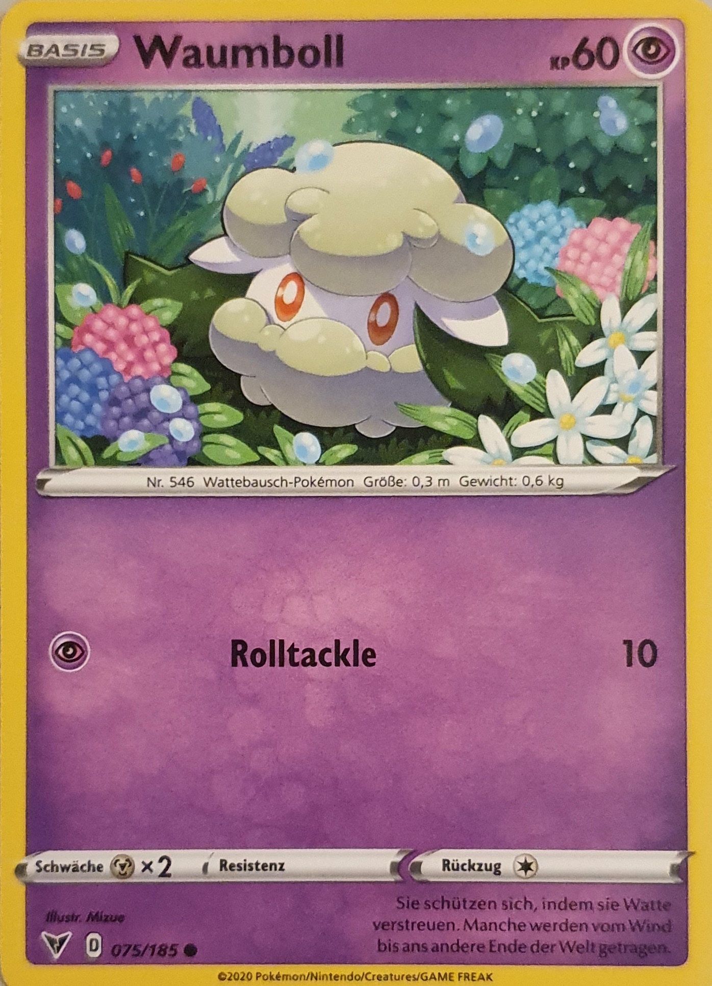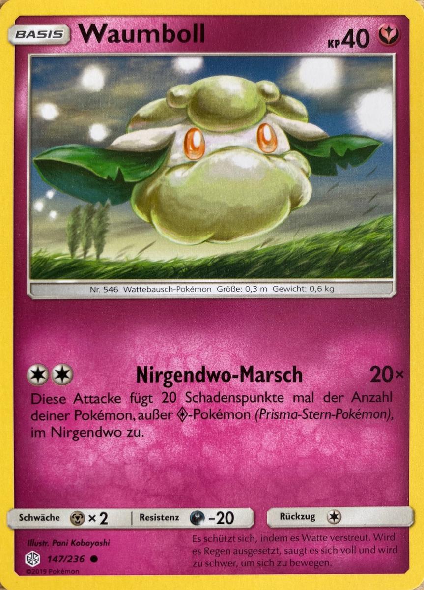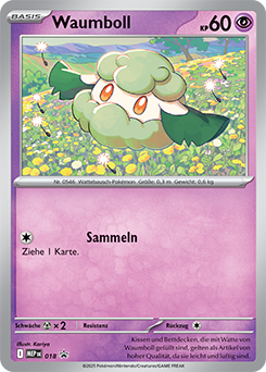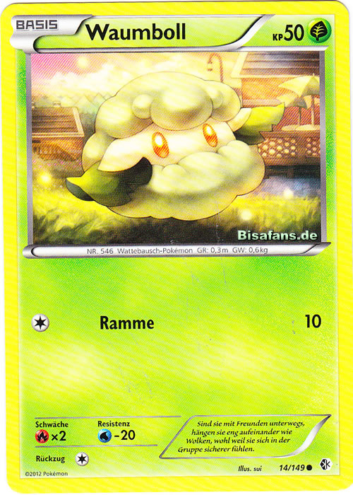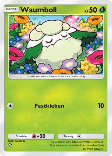 - P Wird es angegriffen, verstreut es zur Täuschung Watte. Es flieht, während der Gegner nach dem wahren Waumboll sucht.