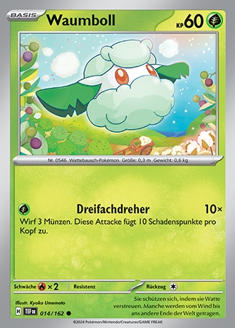 - OR Wird es angegriffen, verstreut es zur Täuschung Watte. Es flieht, während der Gegner nach dem wahren Waumboll sucht.