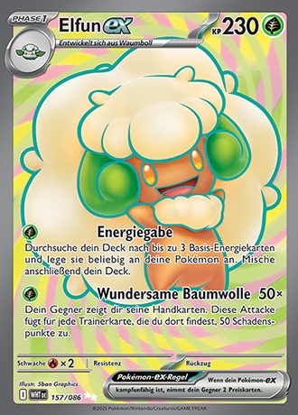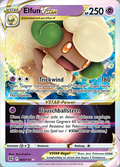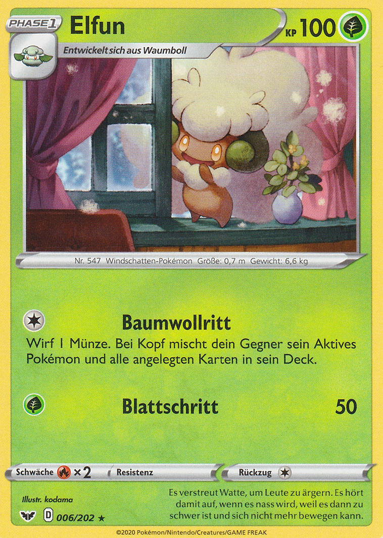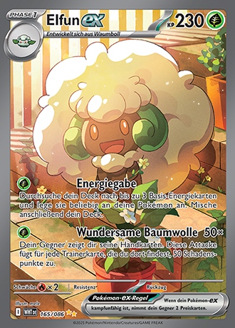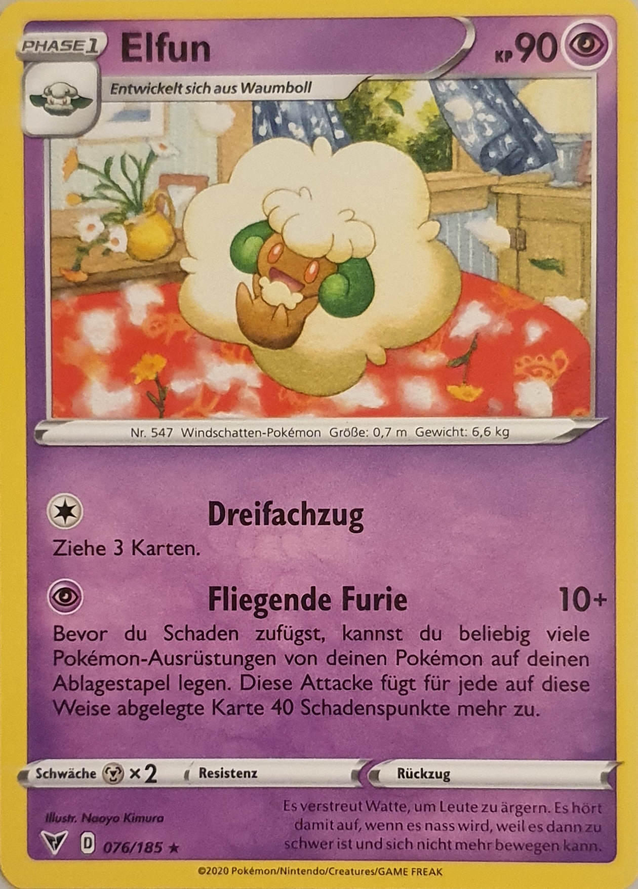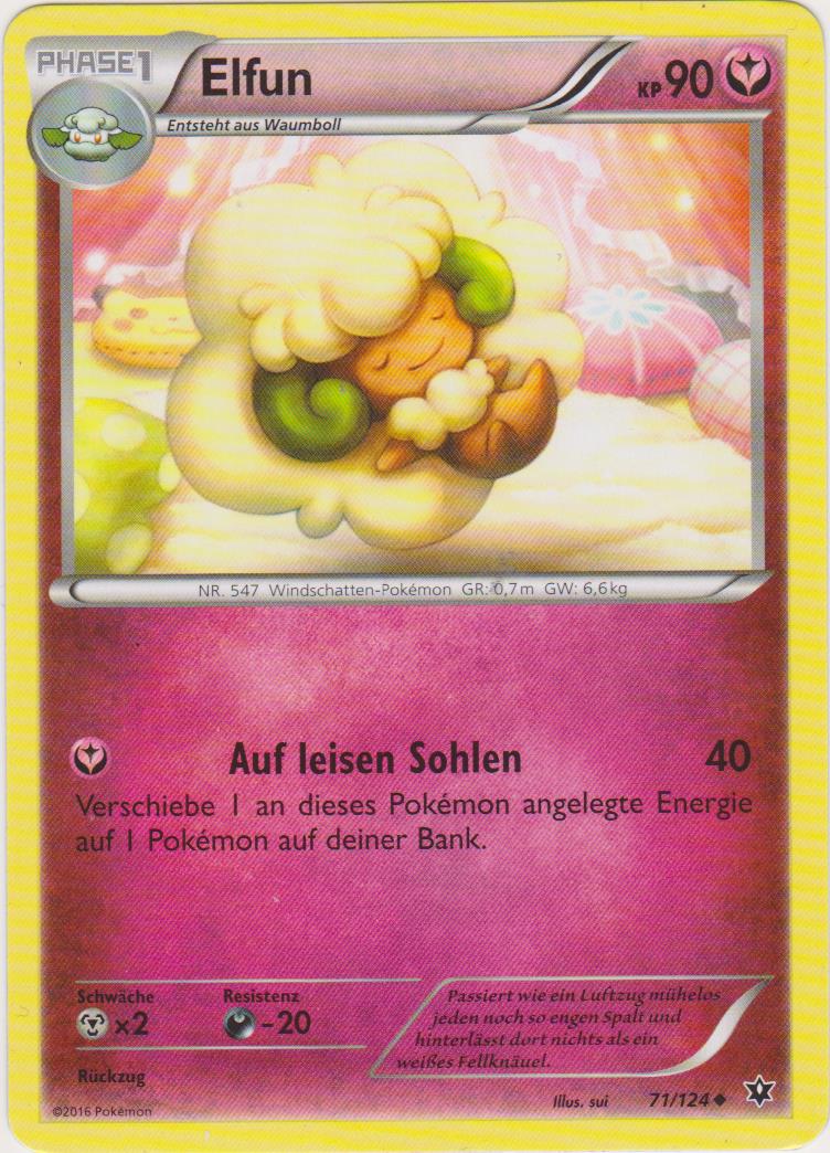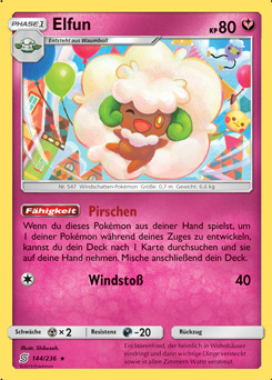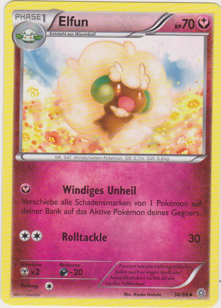 An diesem Pokémon hat sich nicht viel geändert seit es existiert. Immer noch so nervig wie früher, erlaubt es Strolch, Statusattacken mit um +1 erhöhter Priorität einzusetzen. Dabei soll Elfun hauptsächlich den Rückenwind beschwören. Notsituation kann einen ordentlich Schaden machen, besonders, wenn Elfun bereits seinen Fokusgurt verbraucht hat. Zugabe bestraft den Einsatz von Schutzschild oder Setup, während Verhöhner dies von vornherein verhindert bzw. den Gegner zu Verzweifler zwingt, wenn er bereits von Zugabe betroffen ist. Wenn man überwiegend Probleme mit Double Duck (Pelipper + Entoron) hat, kann man auch über Sonnentag als Attacke nachdenken, um Entorons Super-Wassertornado zu negieren und seine Initiative zu halbieren. Wer's braucht kann auch mit Trugträne die gegnerische Spezialverteidigung stark senken, um dann diesen Slot mit dem Partner umzuwummern. Rechte Hand ist auch eine Option und hat prinzipiell dasselbe Ziel wie Trugträne. Empfehlen würde ich die genannten Alternativen für den dritten oder vierten Attackenslot.