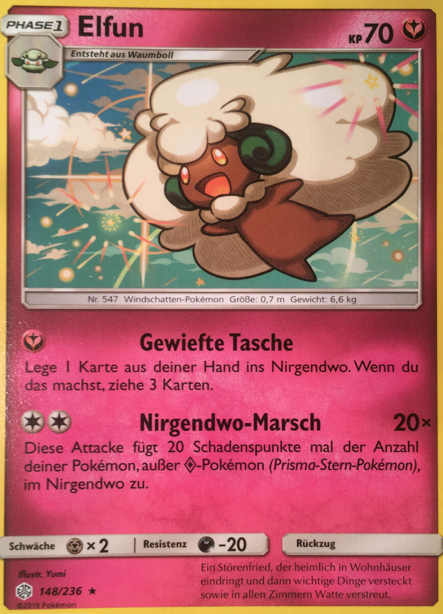 Dieses Elfun ist wahrscheinlich das erste seiner Art, das selbst so manches bulkige Pokémon mit einem Schlag ins Jenseits befördern kann. Natur-Kraft ändert sich abhängig vom gegenwärtigen Terrain. Wird dieses z.B. durch Einwechseln eines Kapus erzeugt, kann man so die Attacke bestimmen, die Elfun beherrschen soll (Elektrofeld -> Donnerblitz, Nebelfeld -> Mondgewalt, Grasfeld -> Energieball, Psychofeld -> Psychokinese). Normium Z passt sich dann der jeweiligen Attacke an. Und da diese noch vom Terrain verstärkt werden, kann man mit sehr effektiven Treffern durchaus signifikanten Schaden verursachen. Zu allem Überfluss handelt es sich bei Natur-Kraft um eine Statusattacke und diese profitiert somit von Strolch.