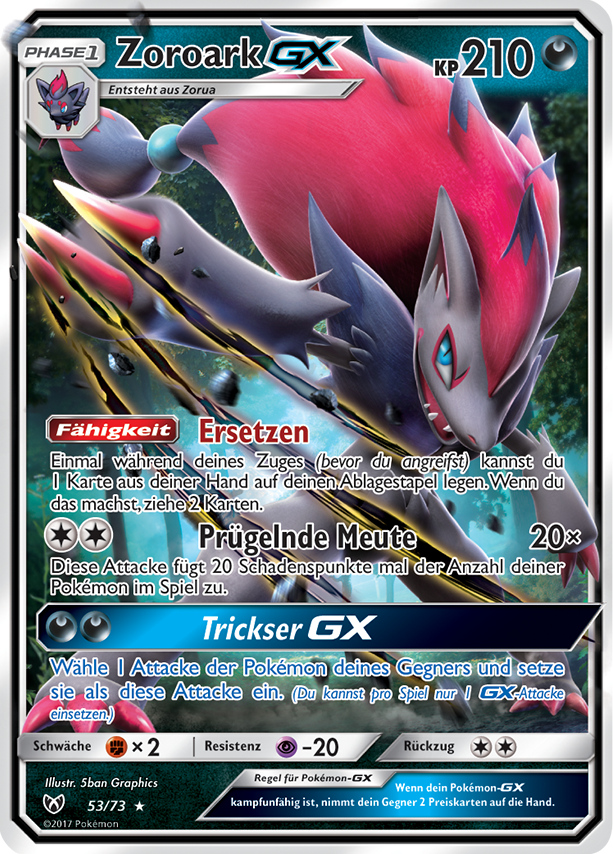 Zoroark ist ein toller Damage Dealer, der mit einem Wahlglas und EVs auf Spezial-Angriff sehr oft mit einem Treffer einen KO landet. Durch seine Attacke Trickbetrug lassen sich auch Status Gegner wie Clavion gut handeln. Kehrtwende ist gut falls Zoroark als erster Kämpfer gewählt wurde und dabei nichts ausrichten kann. Super finde ich auch seine Fähigkeit Trugbild, mit der sich so mancher Gegner täuschen lässt, wenn er ein gegen Psycho anfälliges Pokémon sieht und die Attacke plötzlich keine Wirkung zeigt.