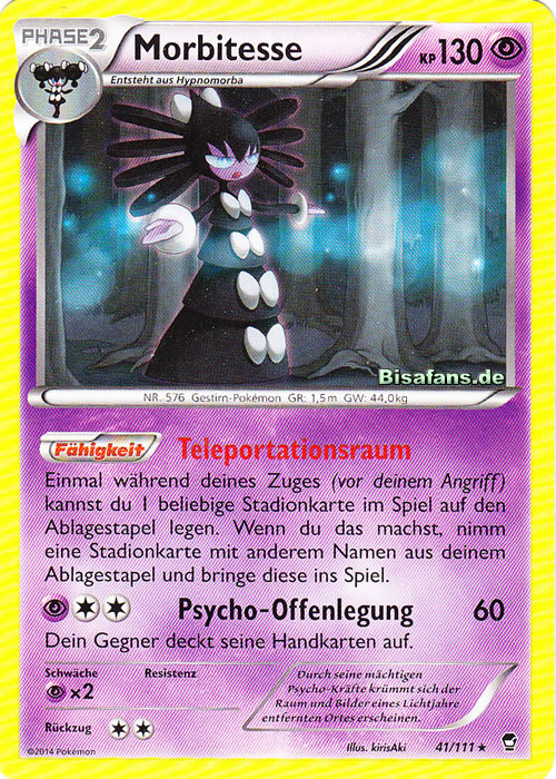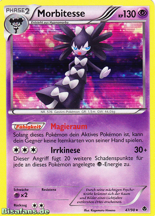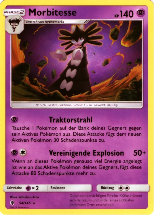 Morbitesse zeichnet sich vor allem durch seine Fähigkeit Wegsperre aus, durch die es alle Pokémon außer Geister und Träger einer Wechselhülle am Auswechseln hindern und somit einige davon sehr zuverlässig eliminieren kann. Dieses Set zielt vor allem auf die für Booster sehr lästigen Unkenntnis-Morlord und Dunkelnebel-Aggrostella ab, kann aber auch Giftspitzen-Absorber wie Anego oder erneut Aggrostella aus dem Spiel nehmen. Generell kann es durch Weitergabe seines Wahlschals mit Trickbetrug in Verbindung mit Erholung auch viele defensive Pokémon wie Chaneira oder Kapu-Kime trappen. Die KP-EVs erlauben das Überleben dreier Geowürfe, sodass man den Schaden von Chaneiras Angriffen mit Erholung wieder ausgleichen kann. Ansonsten wird die Initiative und Angriffskraft maximiert.