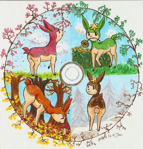 - NPS Das Aussehen dieses Pokémon hängt von der Jahreszeit ab. Normalerweise bleibt es in der Nähe von Kronjuwild, aber es ist so neugierig, dass es manchmal allein loszieht und sich dann verläuft.