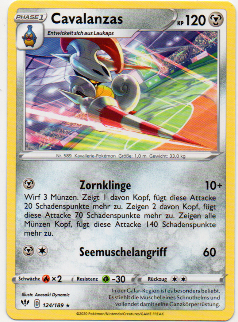Cavalanzas besitzt die Pokédex-Nummer #589 und ist ein Käfer / Stahl-Pokémon der fünften Generation. Seinen ersten Auftritt in Videospielen hat es in Pokémon Schwarz & Weiß.
