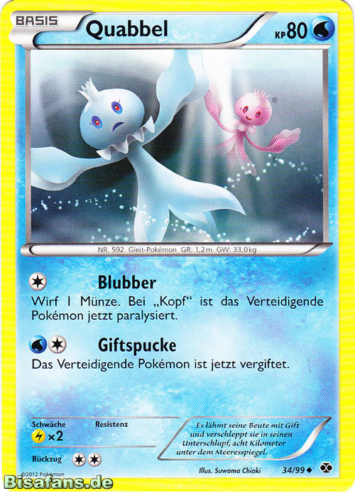 - SH Einer Sage nach sind Quabbel in Wirklichkeit Bewohner einer uralten, im Meer versunkenen Stadt, die zu Pokémon wurden.