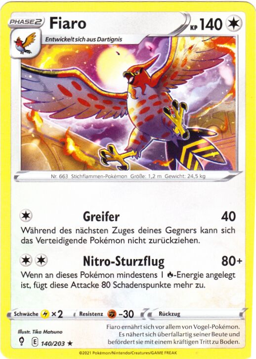 - UM Fiaro ernährt sich vor allem von Vogel-Pokémon. Es nähert sich überfallartig seiner Beute und befördert sie mit einem kräftigen Tritt zu Boden.