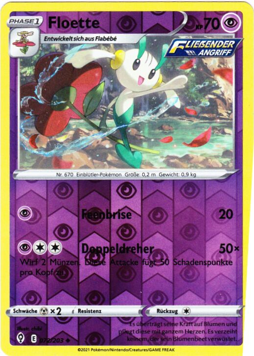 - X Es fliegt auf Wiesen umher und kümmert sich um welkende Blumen. Es setzt deren geheime Kräfte frei und nutzt diese zum Kämpfen.