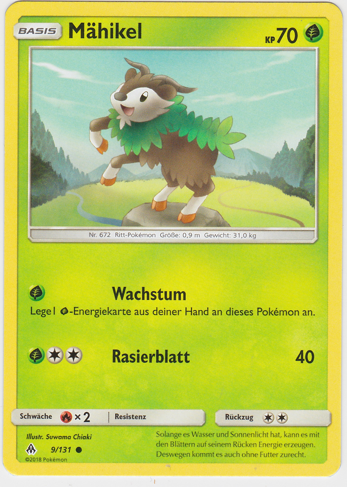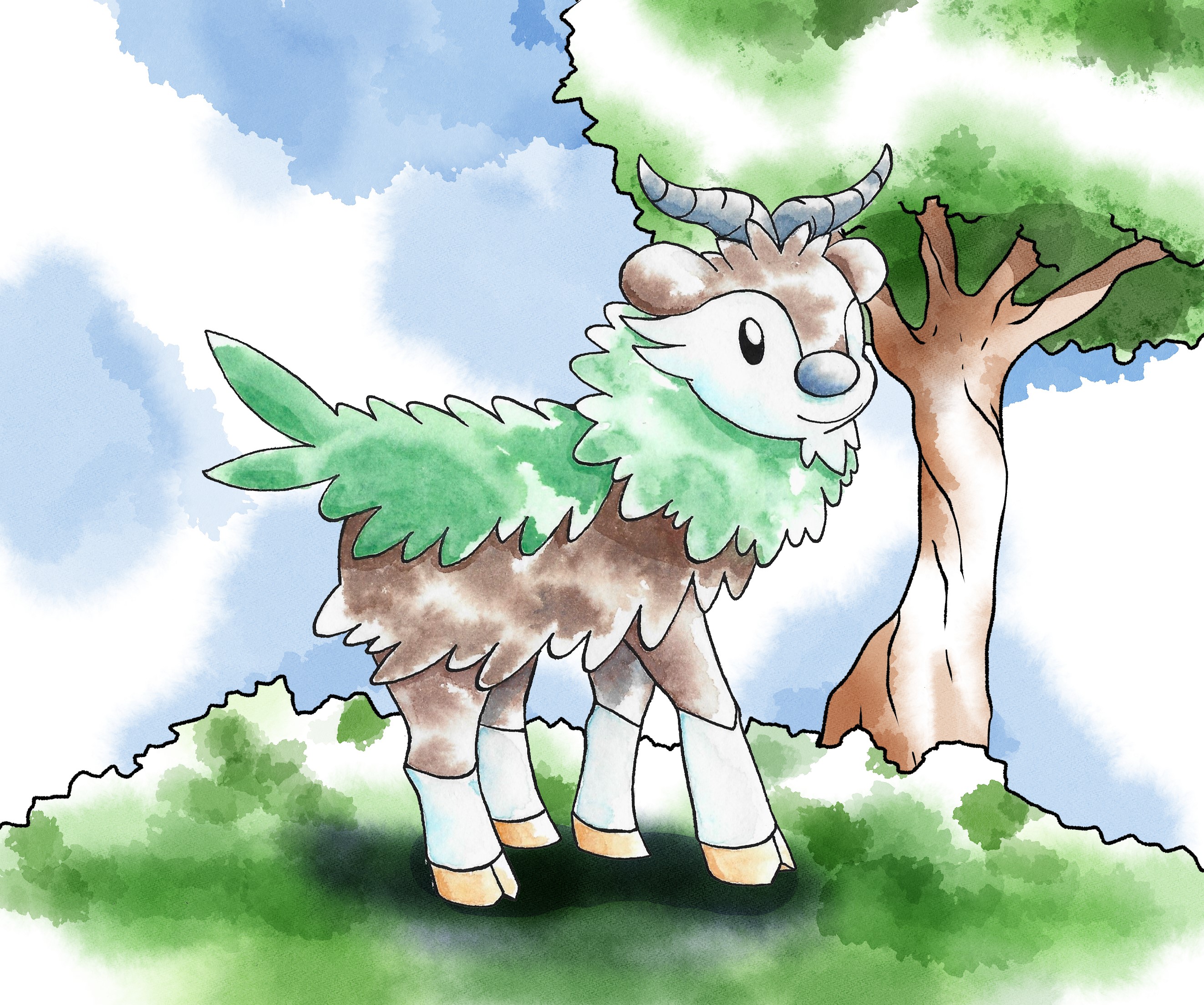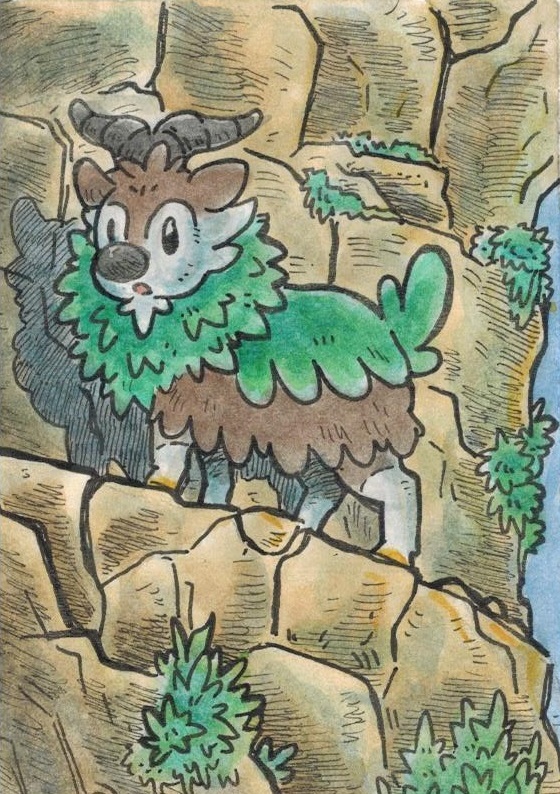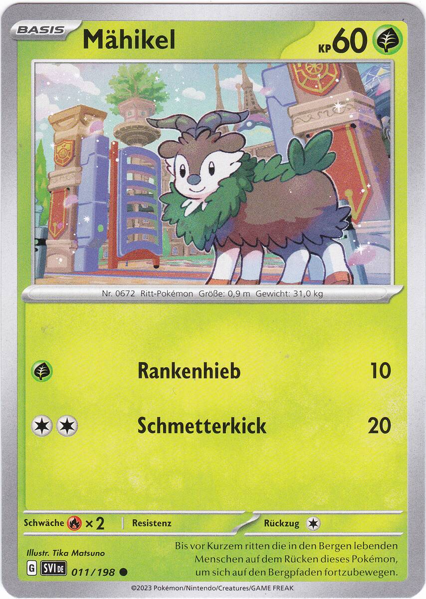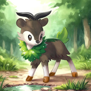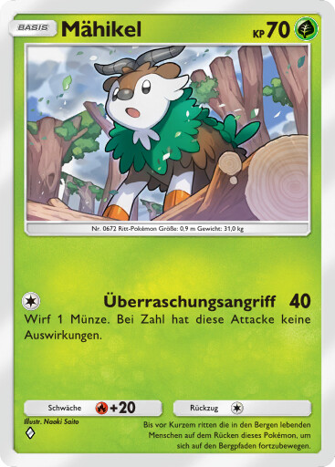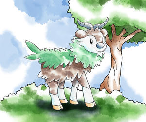 Am Morgen lag Nebel über der Lichtung, die Sonne war noch nicht emporgestiegen. In der Ferne lösten sich Schatten von den Bergen und näherten sich der freien Fläche. Ein größeres Pokemon und mehrere kleine. Aber was waren dies für welche? Die Neuankömmlinge liefen auf allen vieren und die Füße erinnerten an Hufe, auf dem Köpfen waren Hörner zu erkennen. Vielleicht Sesokitz und Kronjuwild? Oder Damhirplex? Nein, diese haben ein Geweih und keine gekrümmten Hörner. Schließlich trat eins der kleineren Pokemon ins aufdämmernde Licht. Das freche Pokemon hatte überwiegend braunes Fell, das Gesicht und der untere Teil der Beine waren weiß gezeichnet und endeten in orangefarbenen Hufen. Kleine, geschwungene Hörner prangten auf dem Kopf. Um den Hals und am Rücken wuchs grünes Fell, welches an Blätter erinnerte. Das Pflanzenpokemon mit dem freundlichen Blick sah sich kurz um und graste dann. Ein Besuch von Mähikel.