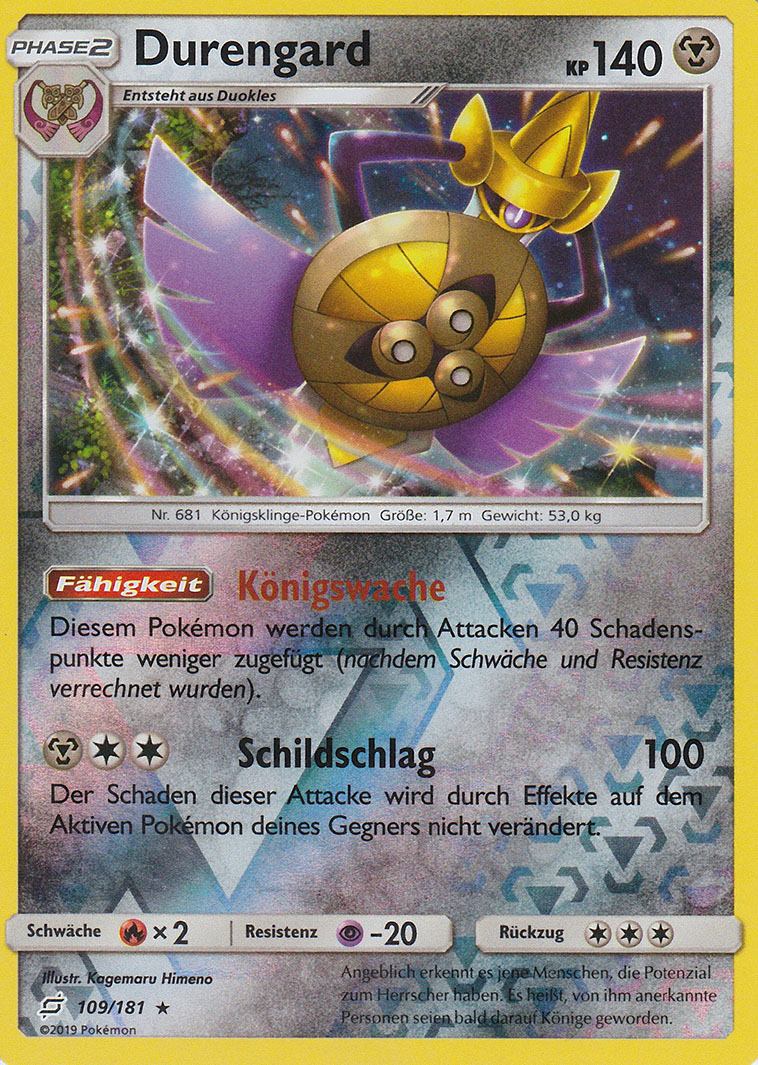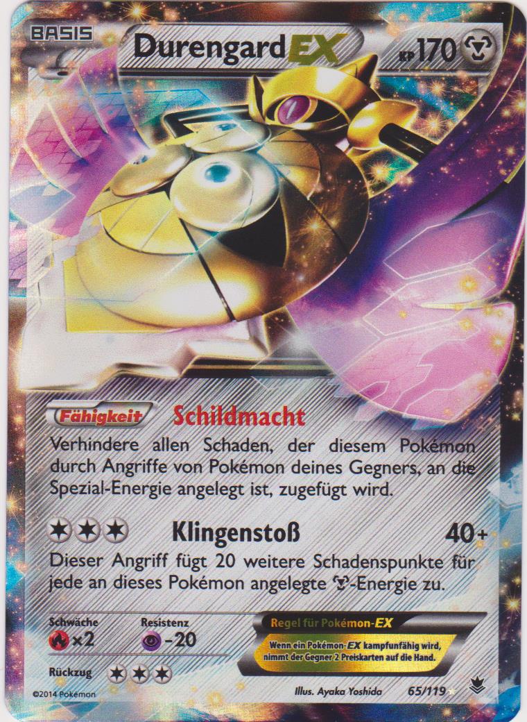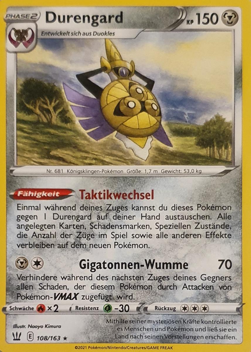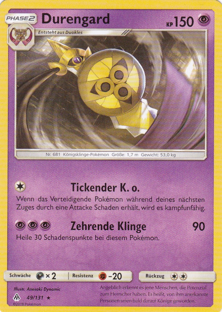 Durengard ist auch in der siebten Generation eines der besten Pokémon im 3on3-Metagame. Das populärste Set ist aktuell wohl das Schwächenschutz-Set, welches in viele Teams Löcher reißen kann. Es gibt nur ganz wenige Pokémon, die Durengard mit einem Schlag besiegen können (Mega-Glurak Y, Knakrack / Mamutel mit einem angriffsboostenden Item sowie geboostete Pokémon), weshalb sich der Schwächenschutz hervorragend eignet, um die Angriffswerte zu verdoppeln und den Gegner mit einer hohen Wahrscheinlichkeit mit einem Schlag zu besiegen. Spukball ist als STAB gesetzt, da es wenige relevante Pokémon im 3on3-Metagame gibt, die Geistattacken resistieren. Lichtkanone ist ebenfalls ein STAB, allerdings anders als Spukball nicht gesetzt, da die meisten Pokémon schon von Spukball abgedeckt werden. Anstelle von Lichtkanone kann man auch Sanctoklinge spielen, welche Mega-Kangama nach Schwächenschutz-Boost besiegt, zudem trifft Sanctoklinge auch Mega-Garados sehr effektiv und Durengard wird somit anders als mit Lichtkanone nicht zu einem Set Up-Opfer der Wasserschlange. Schattenstoß dient als Prioritätsangriff und kann nach einem Boost viele angeschlagene Gegner besiegen oder gegnerische Pokémon zumindestens gut anschlagen, damit diese von Durengards Teampartnern leichter aus dem Weg geschafft werden können. Königsschild ist natürlich gesetzt, da man so oft die Möglichkeit hat, den Angriff des Gegners um zwei Stufen zu senken oder um zurück in die Defensivform zu kommen. Es ist zu bevorzugen, ein initiativesenkendes Wesen zu wählen und zudem die Initiative-DVs so niedrig wie möglich zu halten, um die Möglichkeit zu haben, nach anderen Durengards in die Angriffsform zu gehen und diese so zu besiegen.