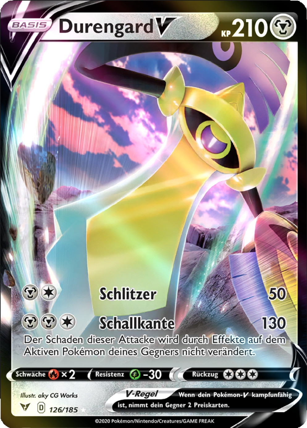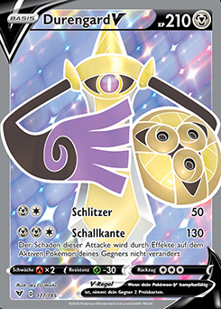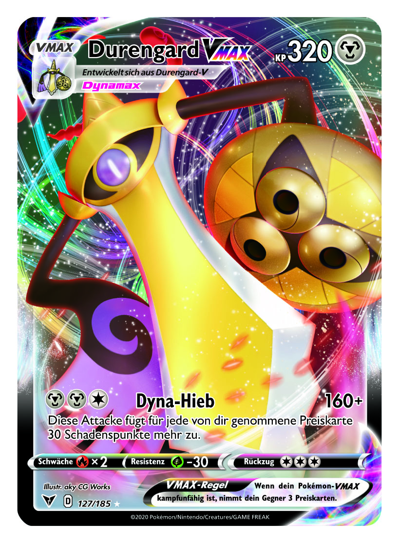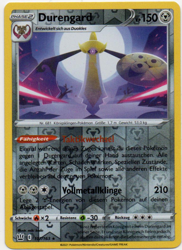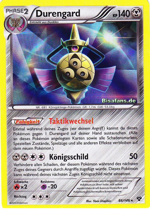 Durengard ist auch in der siebten Generation eines der besten Pokémon im 3on3-Metagame. Das populärste Set ist aktuell wohl das Schwächenschutz-Set, welches in viele Teams Löcher reißen kann. Es gibt nur ganz wenige Pokémon, die Durengard mit einem Schlag besiegen können (Mega-Glurak Y, Knakrack / Mamutel mit einem angriffsboostenden Item sowie geboostete Pokémon), weshalb sich der Schwächenschutz hervorragend eignet, um die Angriffswerte zu verdoppeln und den Gegner mit einer hohen Wahrscheinlichkeit mit einem Schlag zu besiegen. Spukball ist als STAB gesetzt, da es wenige relevante Pokémon im 3on3-Metagame gibt, die Geistattacken resistieren. Lichtkanone ist ebenfalls ein STAB, allerdings anders als Spukball nicht gesetzt, da die meisten Pokémon schon von Spukball abgedeckt werden. Anstelle von Lichtkanone kann man auch Sanctoklinge spielen, welche Mega-Kangama nach Schwächenschutz-Boost besiegt, zudem trifft Sanctoklinge auch Mega-Garados sehr effektiv und Durengard wird somit anders als mit Lichtkanone nicht zu einem Set Up-Opfer der Wasserschlange. Schattenstoß dient als Prioritätsangriff und kann nach einem Boost viele angeschlagene Gegner besiegen oder gegnerische Pokémon zumindestens gut anschlagen, damit diese von Durengards Teampartnern leichter aus dem Weg geschafft werden können. Königsschild ist natürlich gesetzt, da man so oft die Möglichkeit hat, den Angriff des Gegners um zwei Stufen zu senken oder um zurück in die Defensivform zu kommen. Es ist zu bevorzugen, ein initiativesenkendes Wesen zu wählen und zudem die Initiative-DVs so niedrig wie möglich zu halten, um die Möglichkeit zu haben, nach anderen Durengards in die Angriffsform zu gehen und diese so zu besiegen.