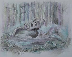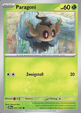 - SW Die Seele eines Kindes, das sich im Wald verlief und dabei ums Leben kam, nistete sich in einem Baumstumpf ein und wurde zu diesem Pokémon.