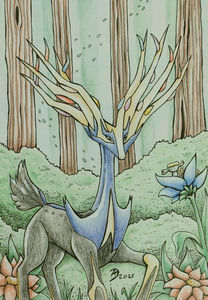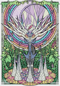 Doch das Wasser spiegelt nicht die Blätter, sondern etwas anderes, etwas Mächtigeres. Wenn der Wald schweigt und kein Pokemon sich bewegt, formt sich aus dem Regenbogen das Bild eines Geweihes. So bunt wie gebrochene Scherben, die von Licht getroffen werden. Unzählige Farben, die sich zu verändern scheinen, wenn man nur lange genug hinsieht.