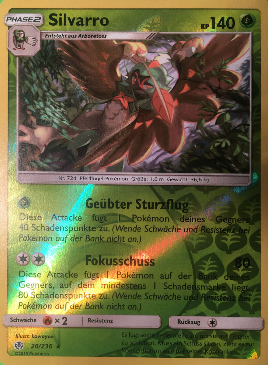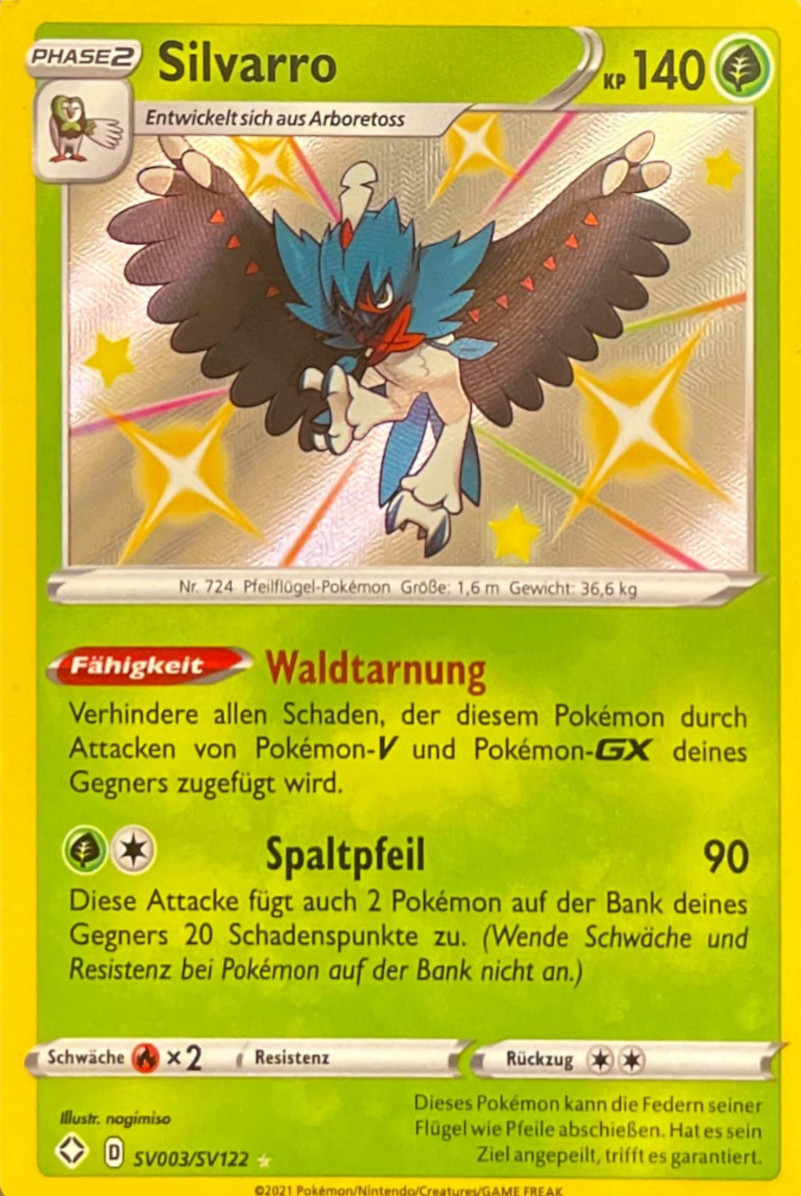 - S Dieses Pokémon kann die Federn seiner Flügel wie Pfeile verschießen. Dabei ist es so präzise, dass es einen Kiesel auf 100 m durchbohrt.