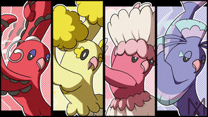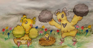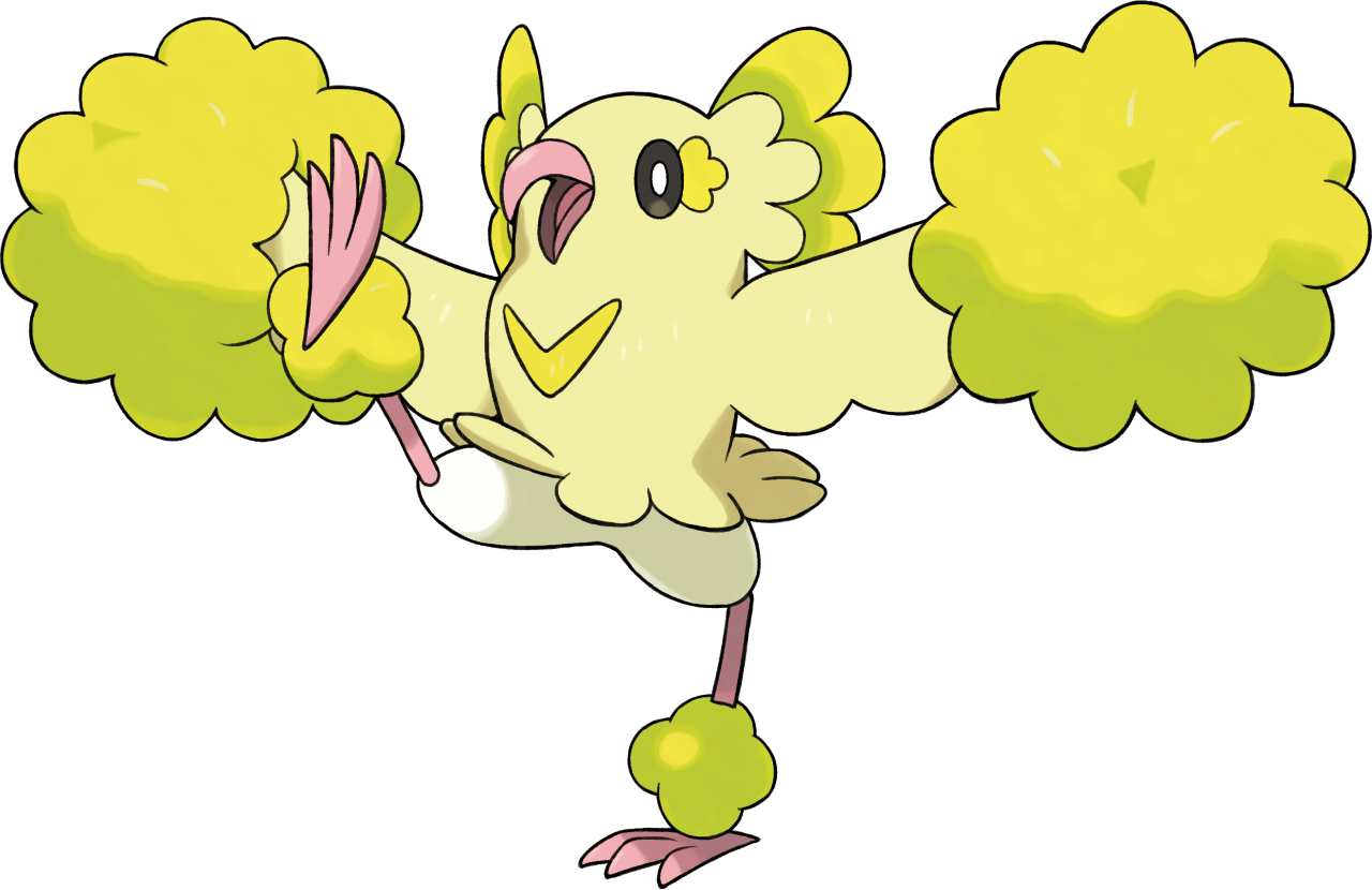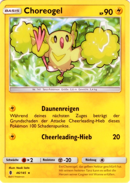 - S Ein Choreogel, das gelben Nektar geschlürft hat. Mit seinem heiteren Tanz kann es selbst die Herzen seiner Gegner mit Wonne erfüllen.