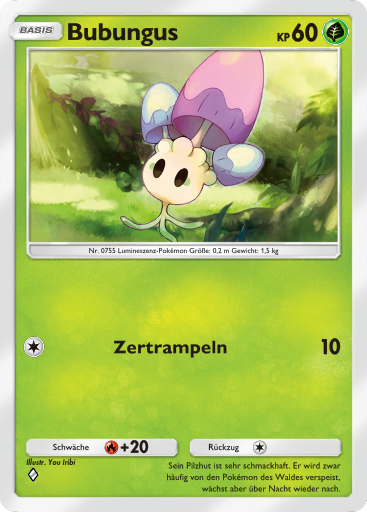 - SH Auch die hellsten Tage verbringt Bubungus in dunklen Wäldern. Es streut blinkende Sporen aus, um seine Gegner in den Schlaf zu lullen.